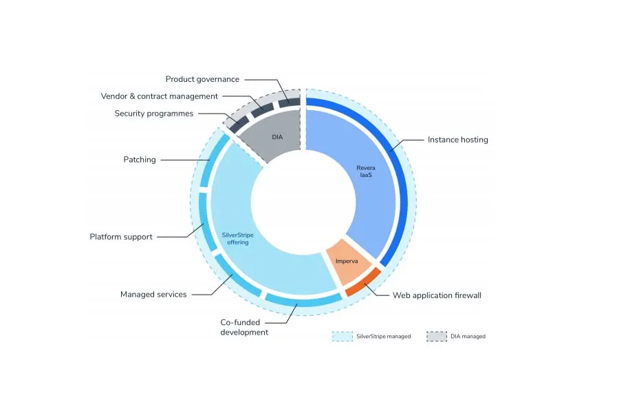 Essentially, the CWP brought together infrastructure-as-a-service (hosting), platform-as-a-service (the CMS and support), and security under the governance of the Department of Internal Affairs (DIA), leveraging the services of Silverstripe, Rivera, and Imperva. As a diagram, it looks like this: